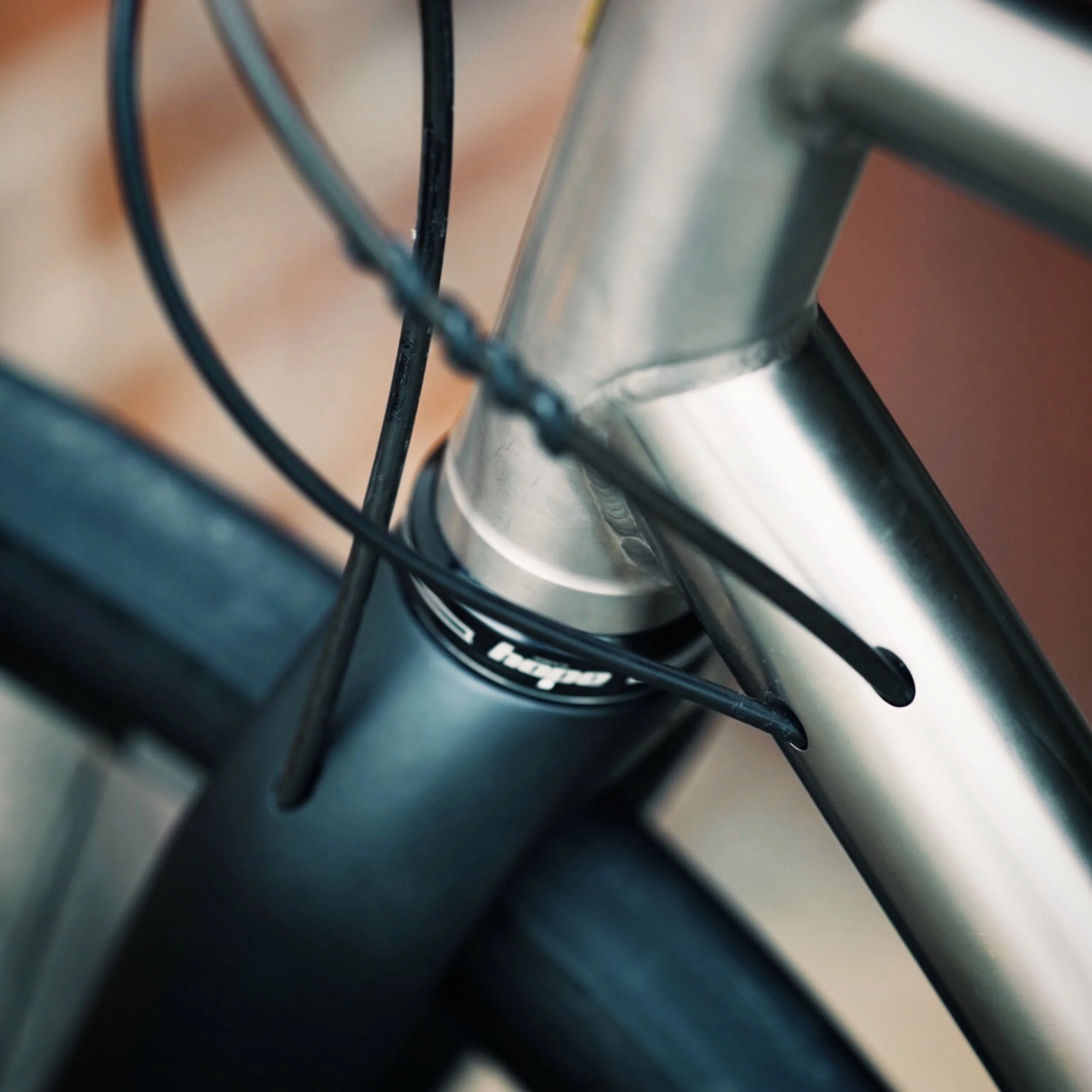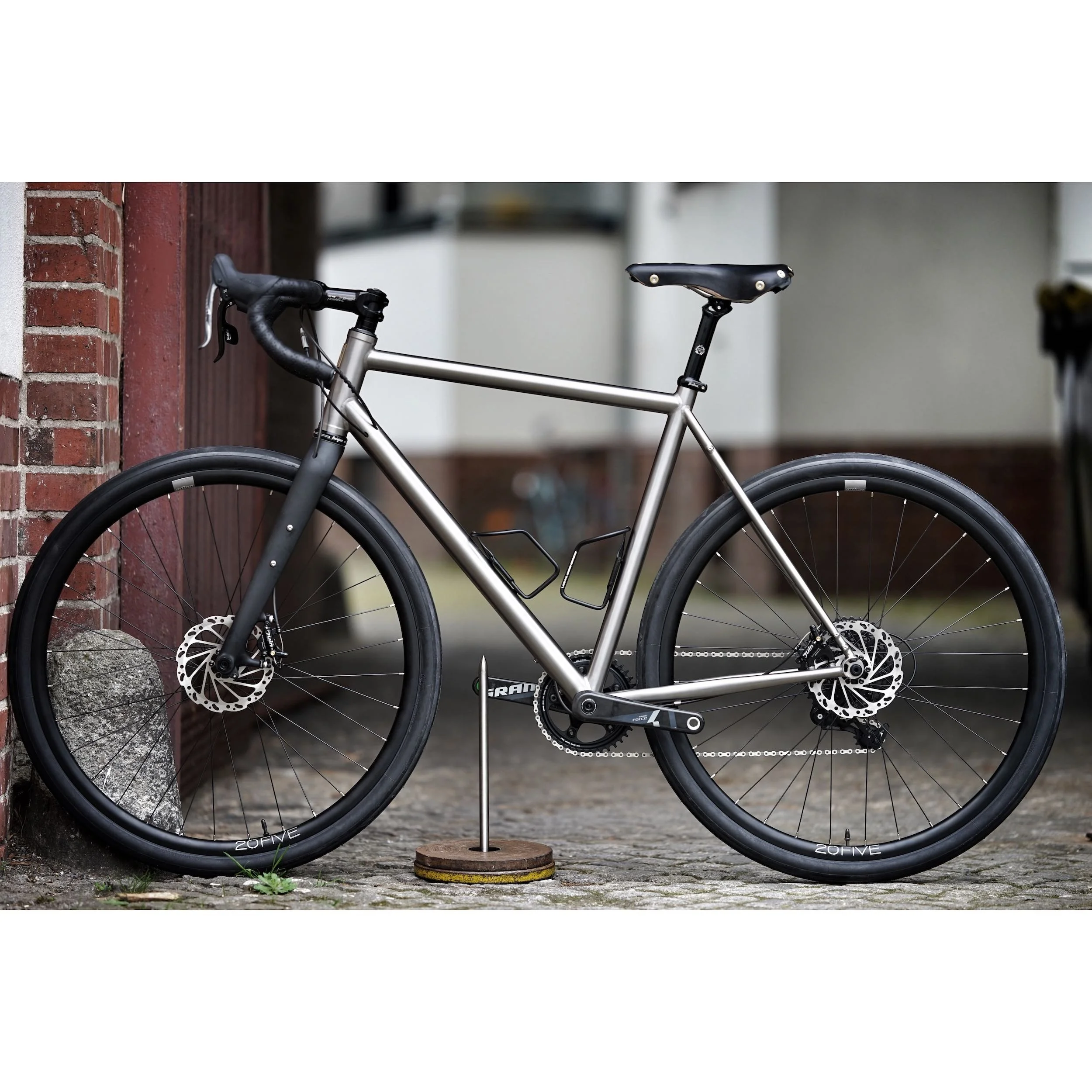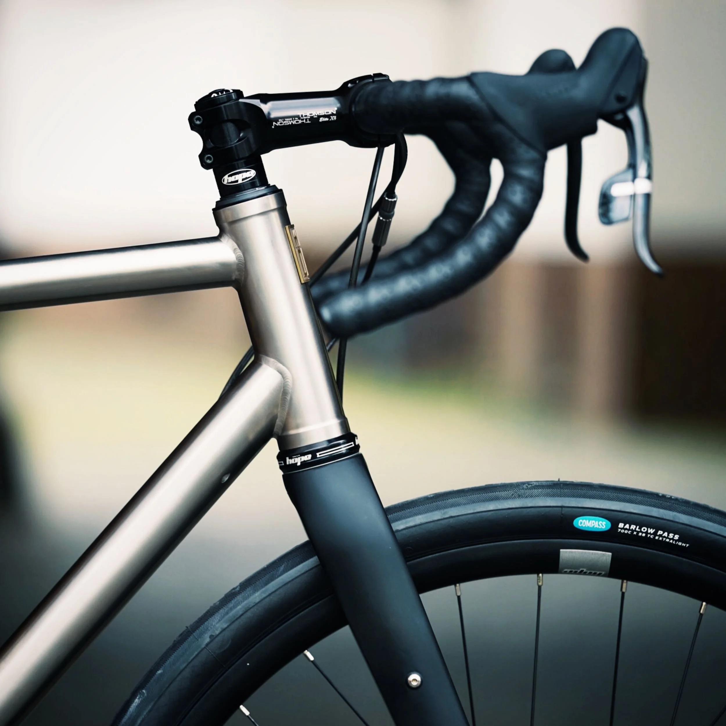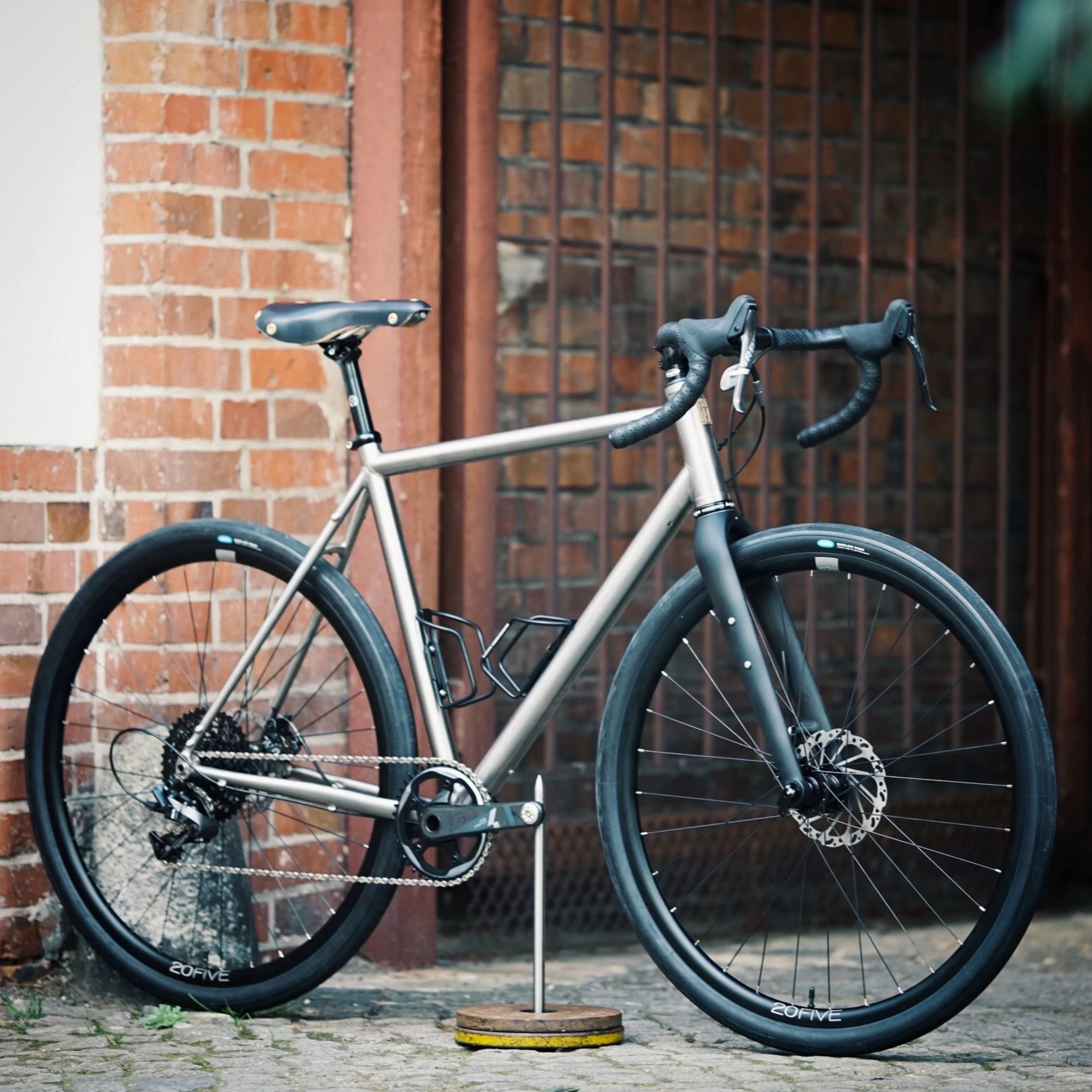 Titanium Grade 9 butted Tubes . Schaltung: 42Z:10-42 Sram Force 1 11-fach. Carbon Gabel mit Ösen, Steckachsen, Innen verlegte Züge, 3 Flaschenhalter, Vorbereitung für Schutzbleche, Beleuchtung und Gepäckträger, Laufräder + Steuersatz: Hope, Vorbau: Thomson, Lenker: Salsa Cowbell 420mm, Leder Lenkerband, Bremsen: Juintech , Reifen: Rene Herse / compass Barlow Pass extra light 700x38mm, Gewicht: 9.4 kg, Komplettbike: 6.300€