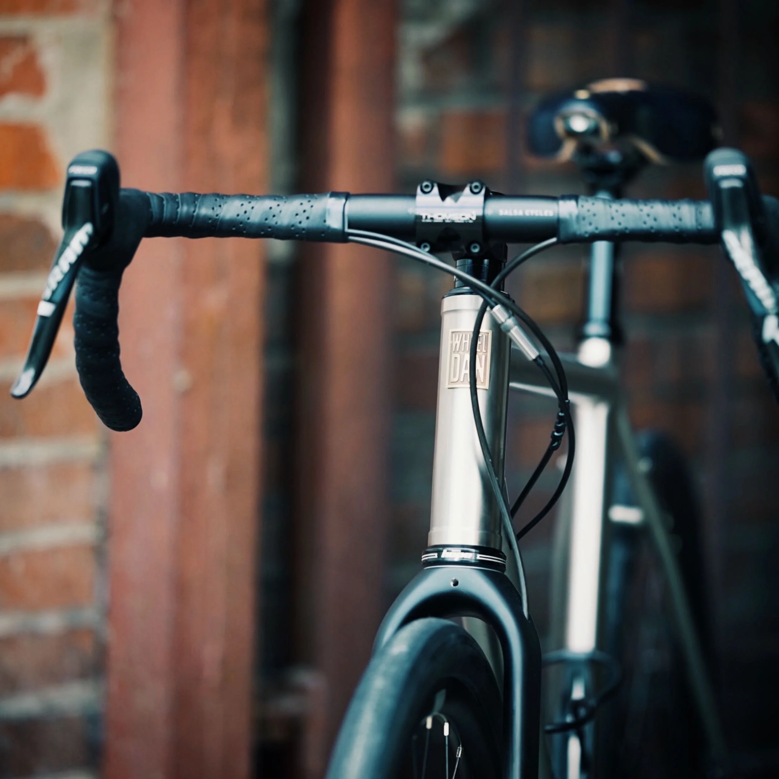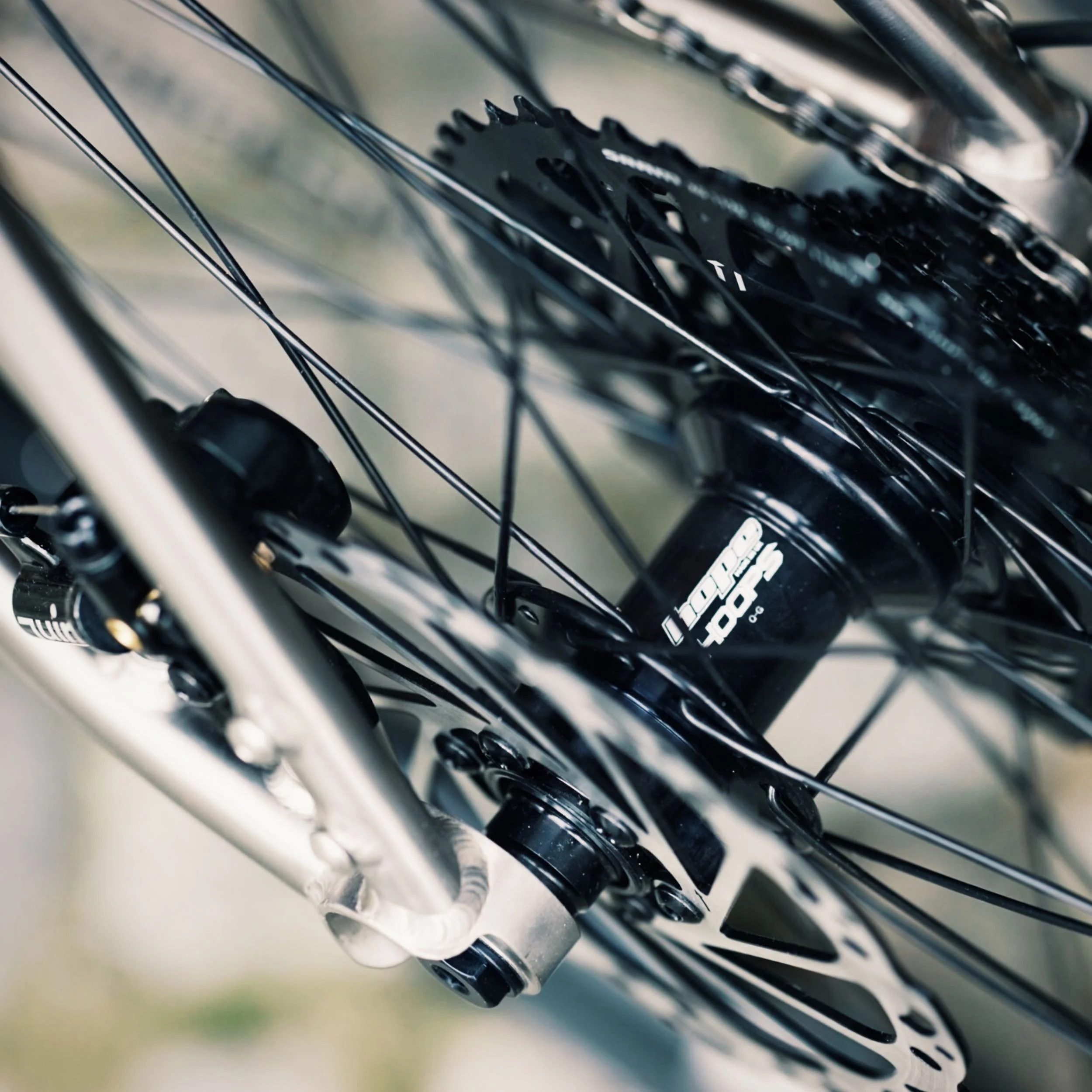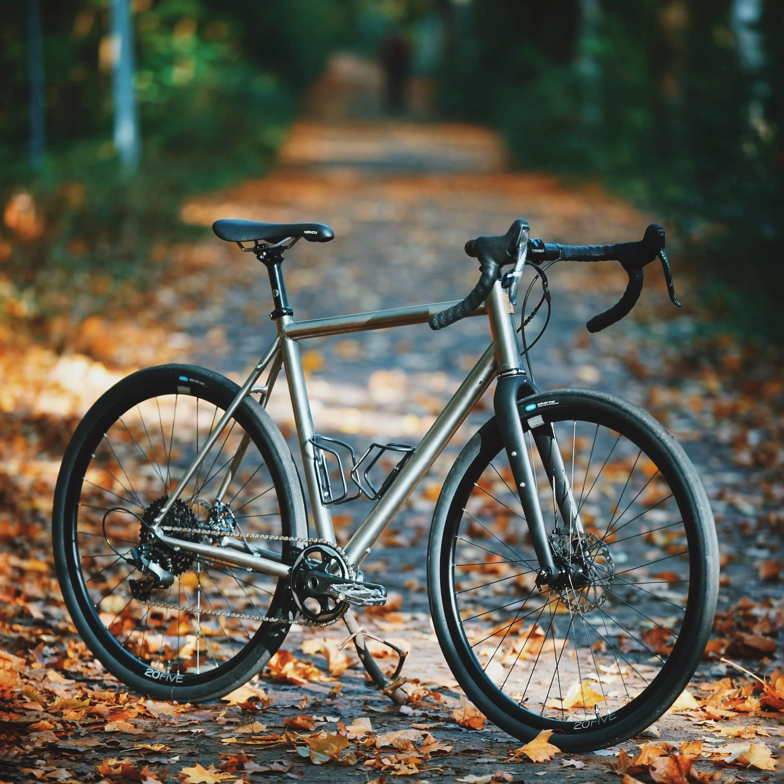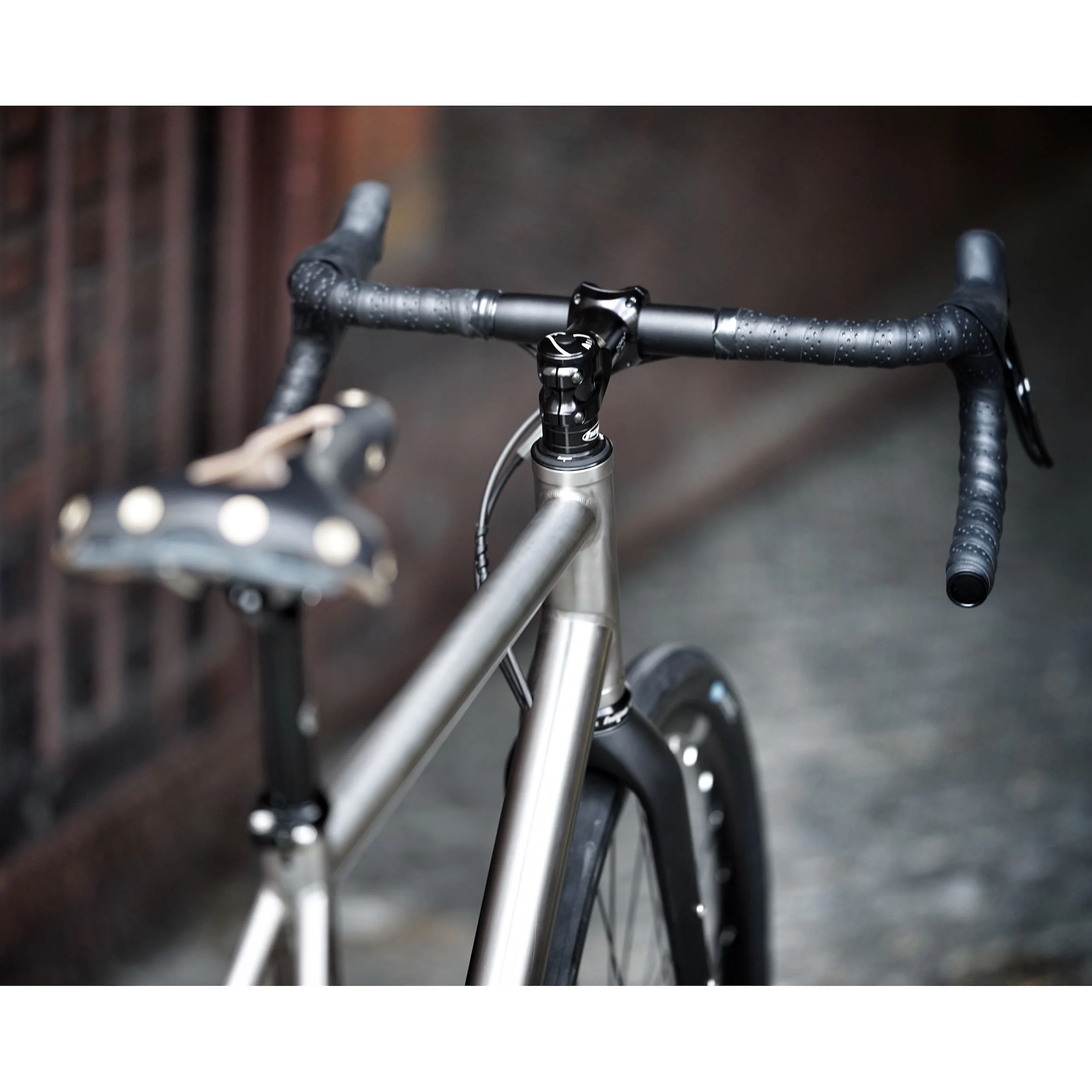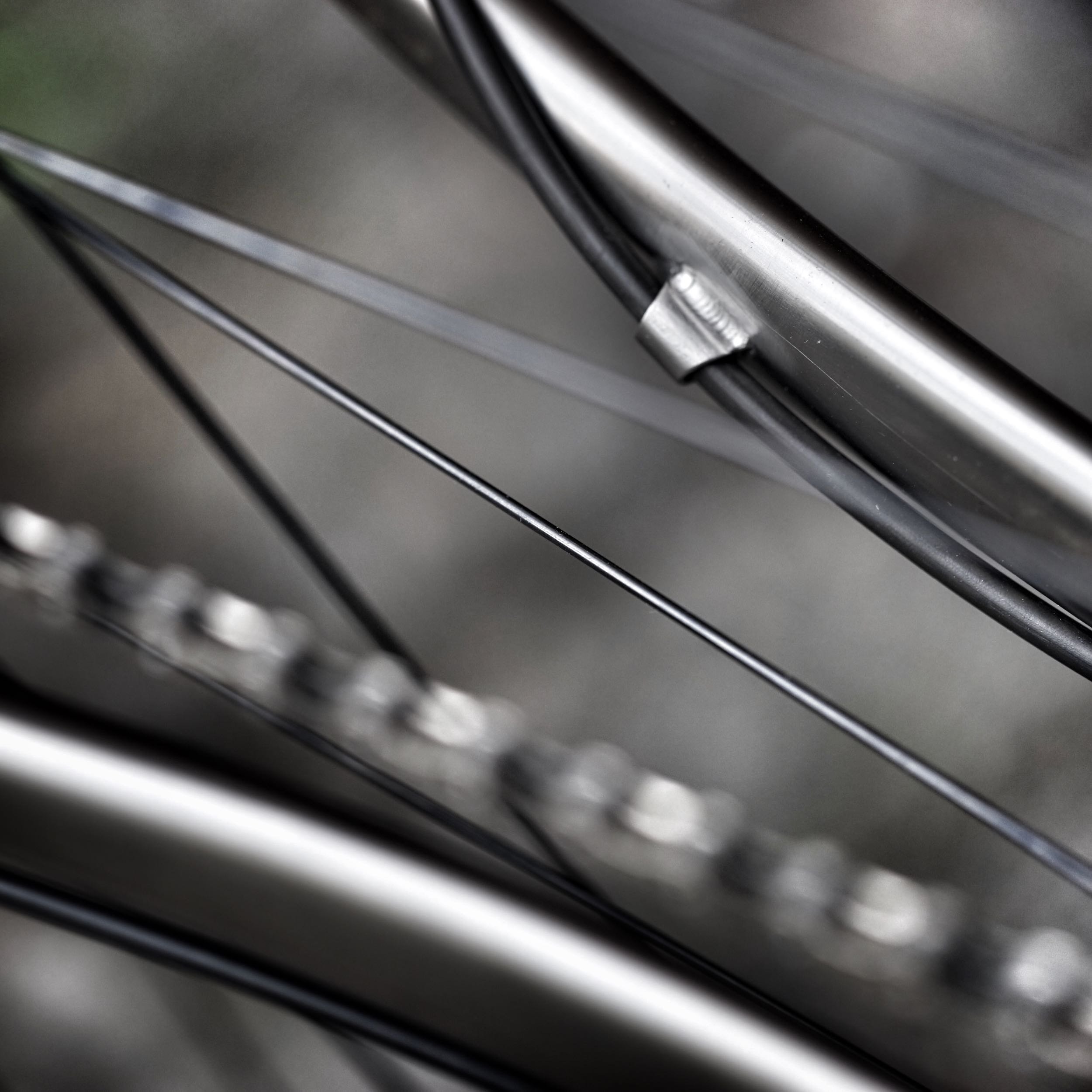 Titanium Grade 9 butted Tubes . Schaltung: 42Z:10-42 Sram Force 1 11-fach. Carbon Gabel mit Ösen, Steckachsen, Innen verlegte Züge, 3 Flaschenhalter, Vorbereitung für Schutzbleche, Beleuchtung und Gepäckträger, Laufräder + Steuersatz: Hope, Vorbau: Thomson, Lenker: Salsa Cowbell 420mm, Leder Lenkerband, Bremsen: Juintech , Reifen: Rene Herse / compass Barlow Pass extra light 700x38mm, Gewicht: 9.4 kg, Komplettbike: 6.300€
