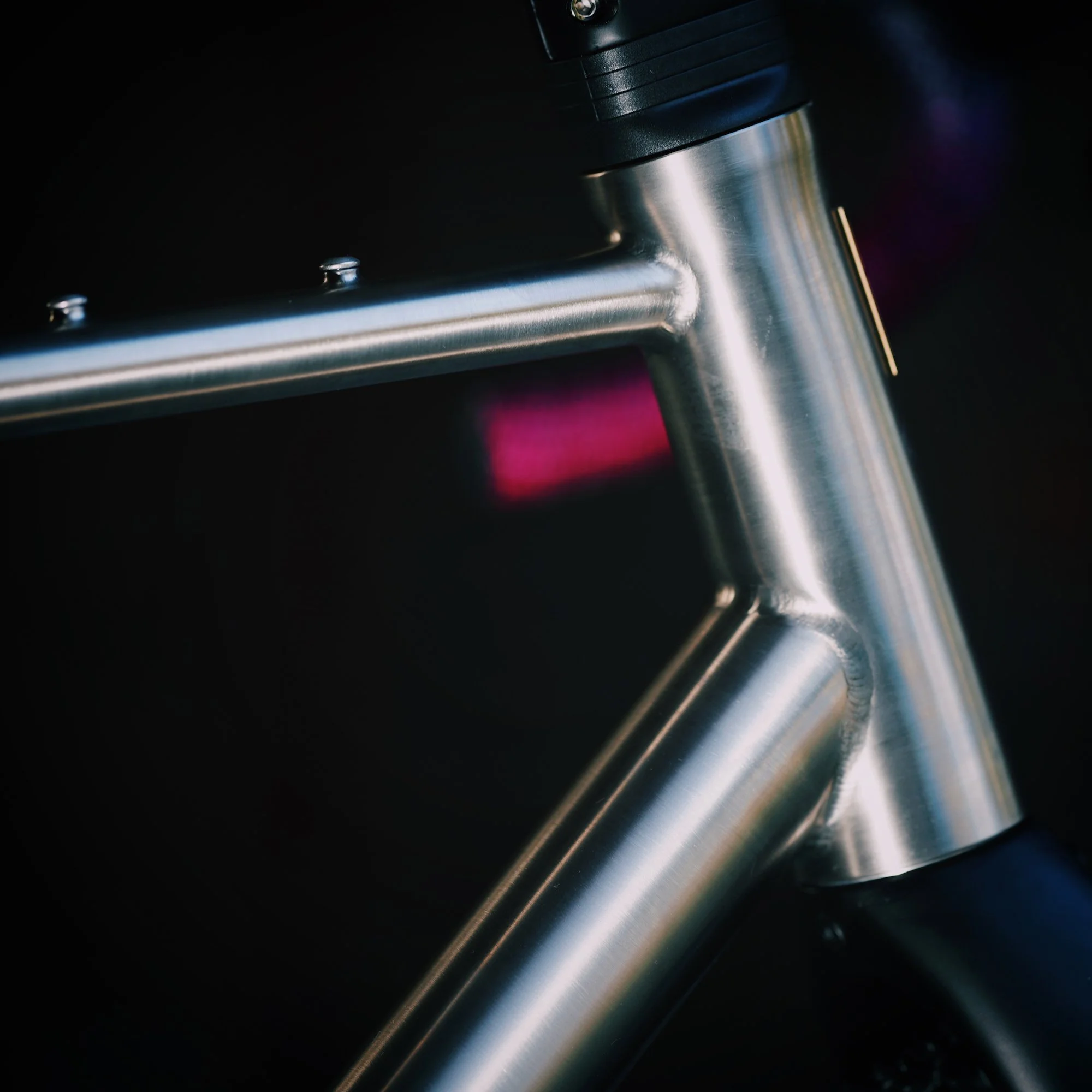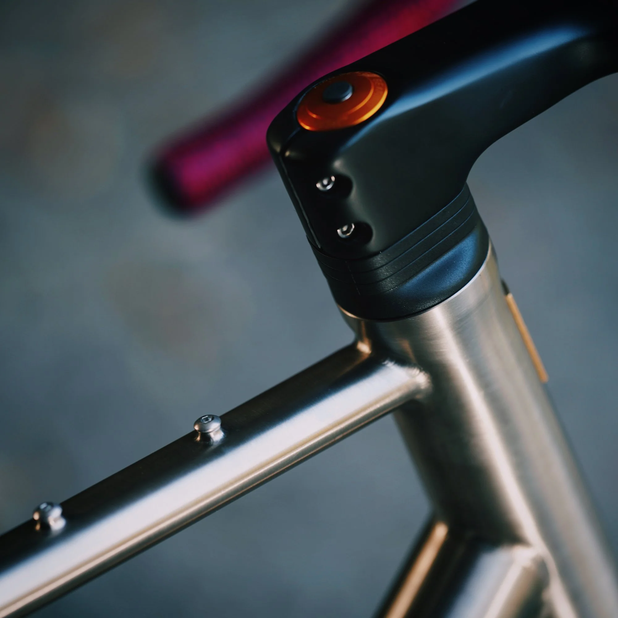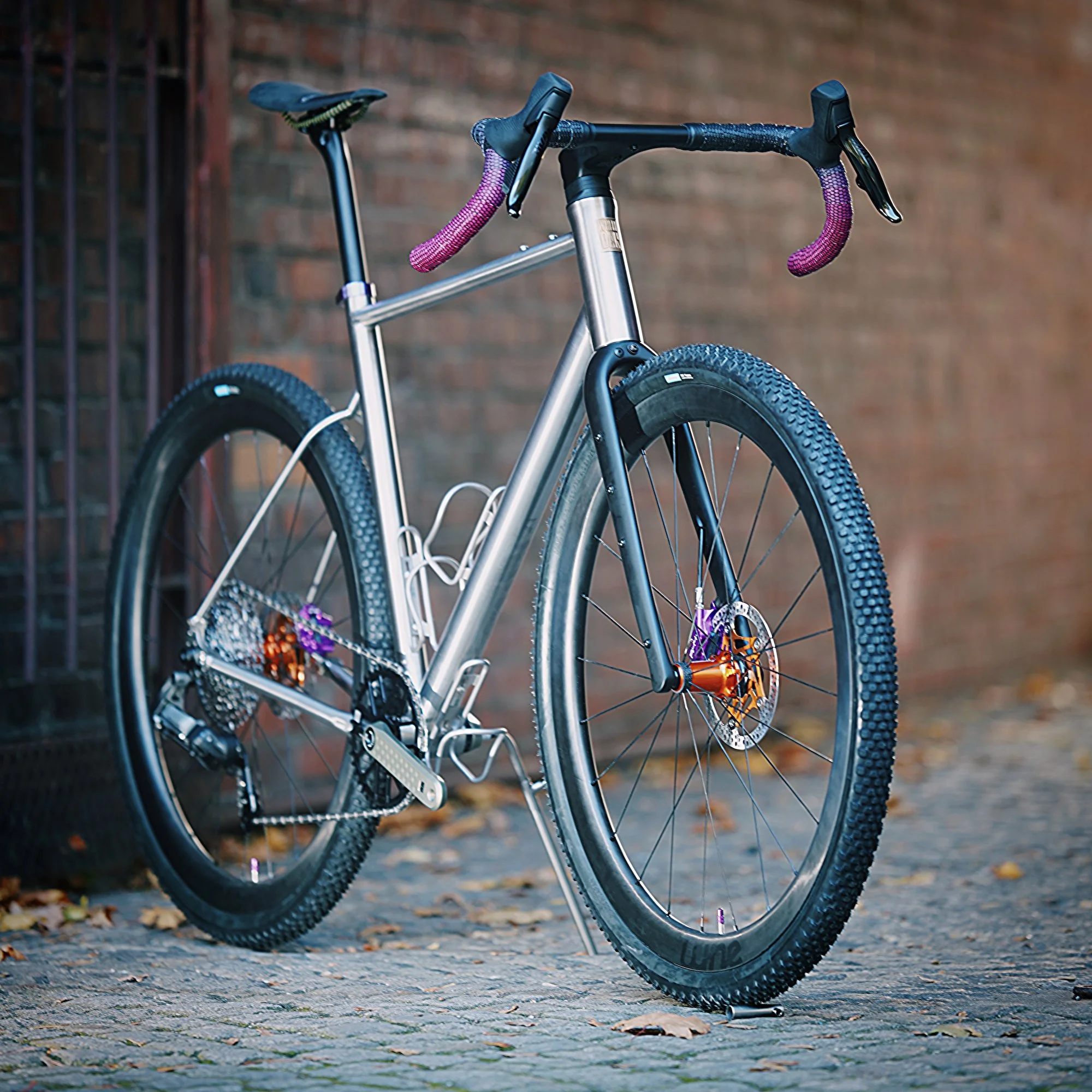 Ein leichtes, robustes und vor allem schnelles Bike aus dem Material der Magie. Handgefertigt in Deutschland von WHEELDAN. Absolut aufgeräumte Optik dank voll integriertem Cockpit. Bremszüge verlaufen in Rahmen und Gabel, geschaltet wird per Funk. Rahmen mit starkem unterem Teil für die Portion Steifigkeit und zartem Oberteil um über Unebenheiten zu schweben. Gemacht für Reifen in der Dimension bis 700x50. Reifen mit genügend Grip und Geschmeidigkeit. Gesamtgewicht 8.9kg. 4 Paar Ösen fürs Allerlei. Dazu 2 Dreifach-Ösen an der Gabel. Der kühlen zurückhaltenden Optik des Titan setzen wir ein paar warme Kontraste an die Seite. Die Rahmengrösse passt für Menschen von ca 175 bis 185cm. Showbike für die Messe BESPOKED in Dresden. Rahmenbauers Traumbike für schnelle Touren!