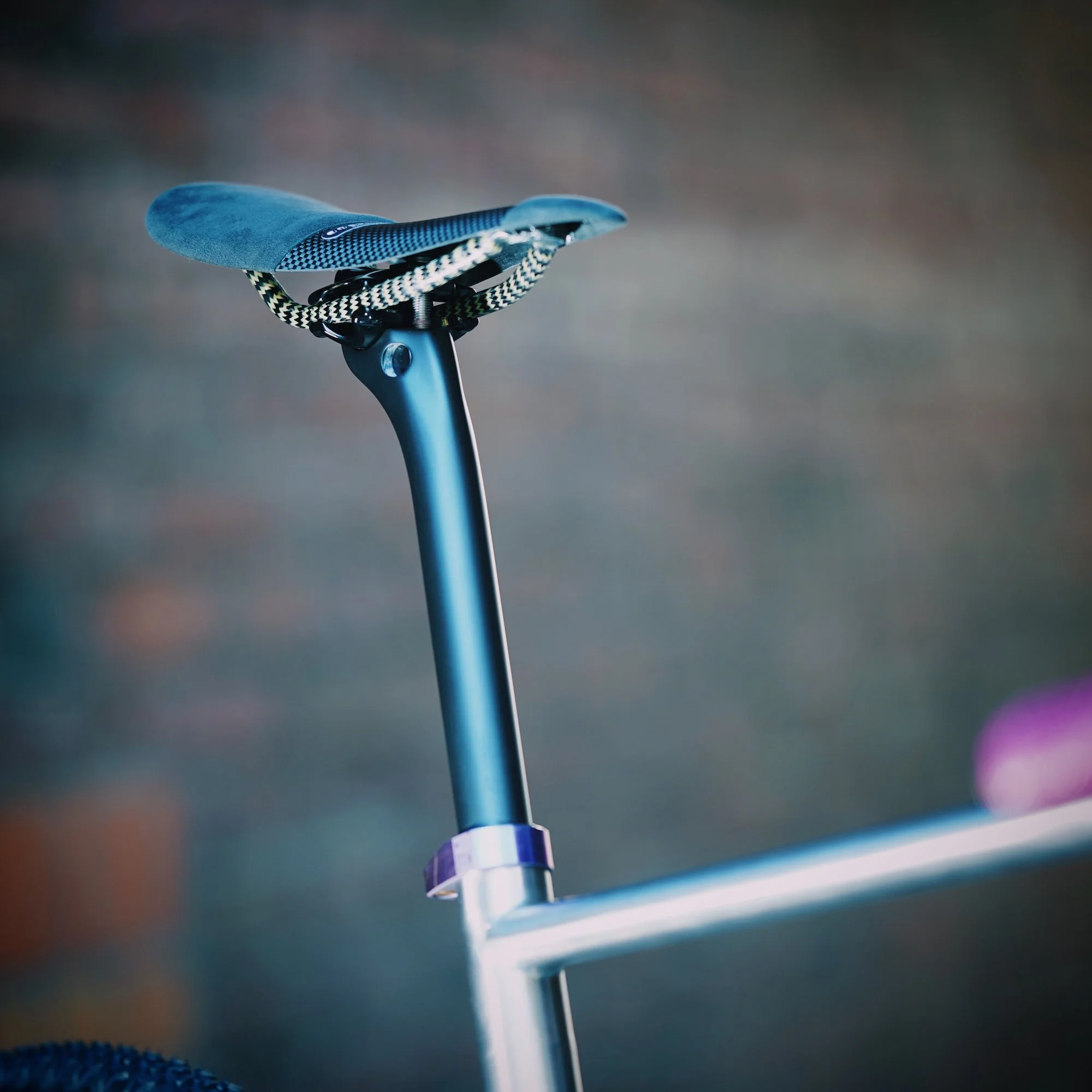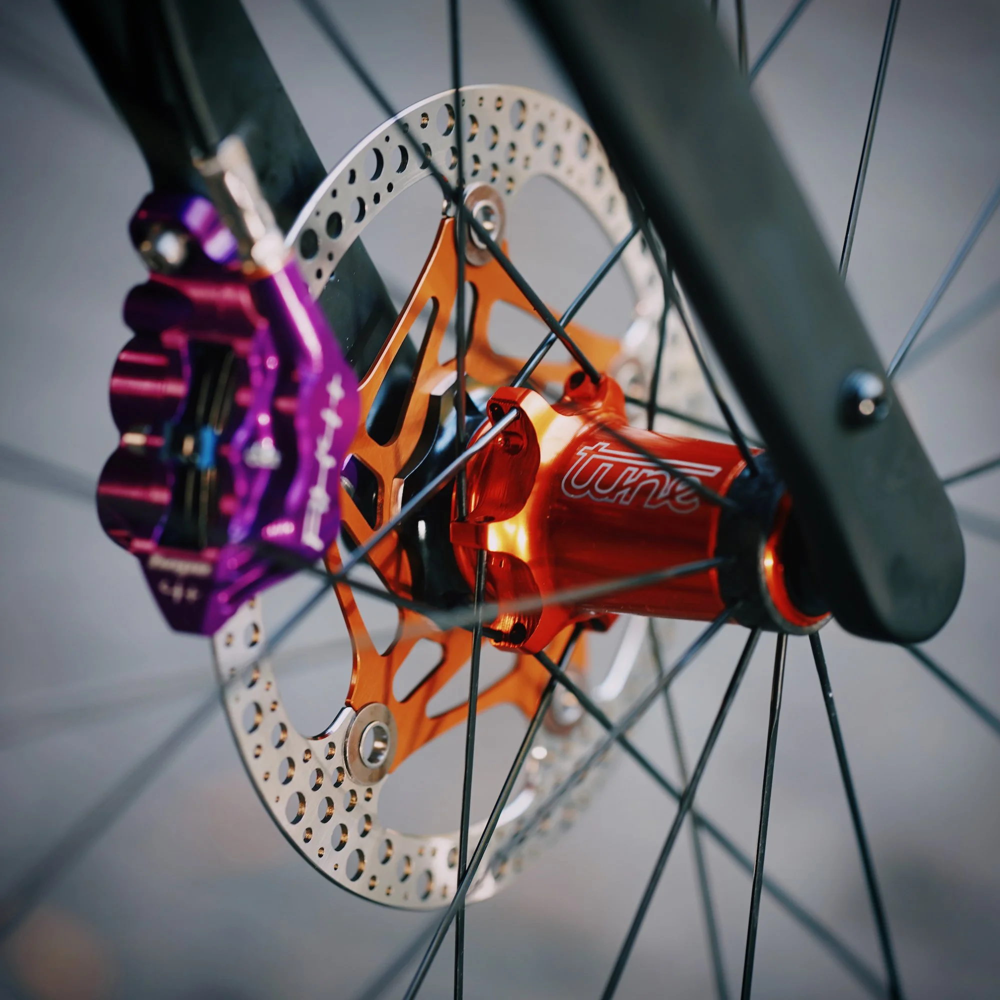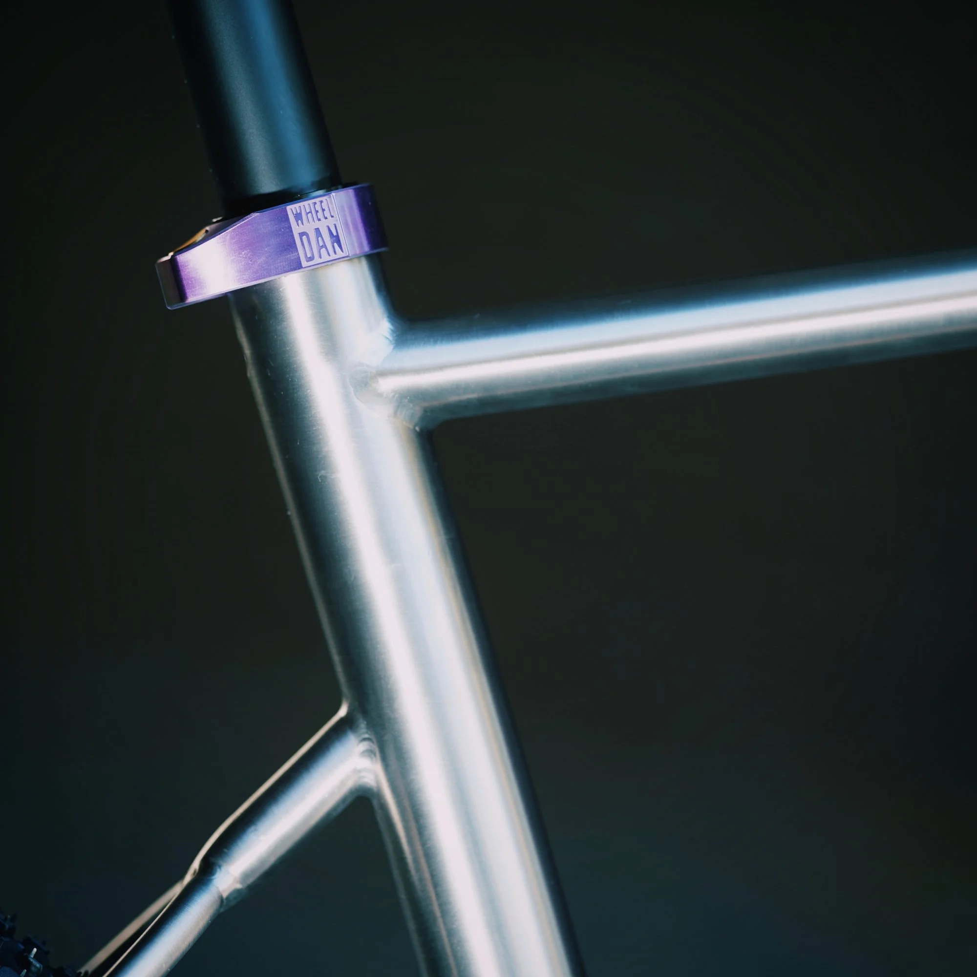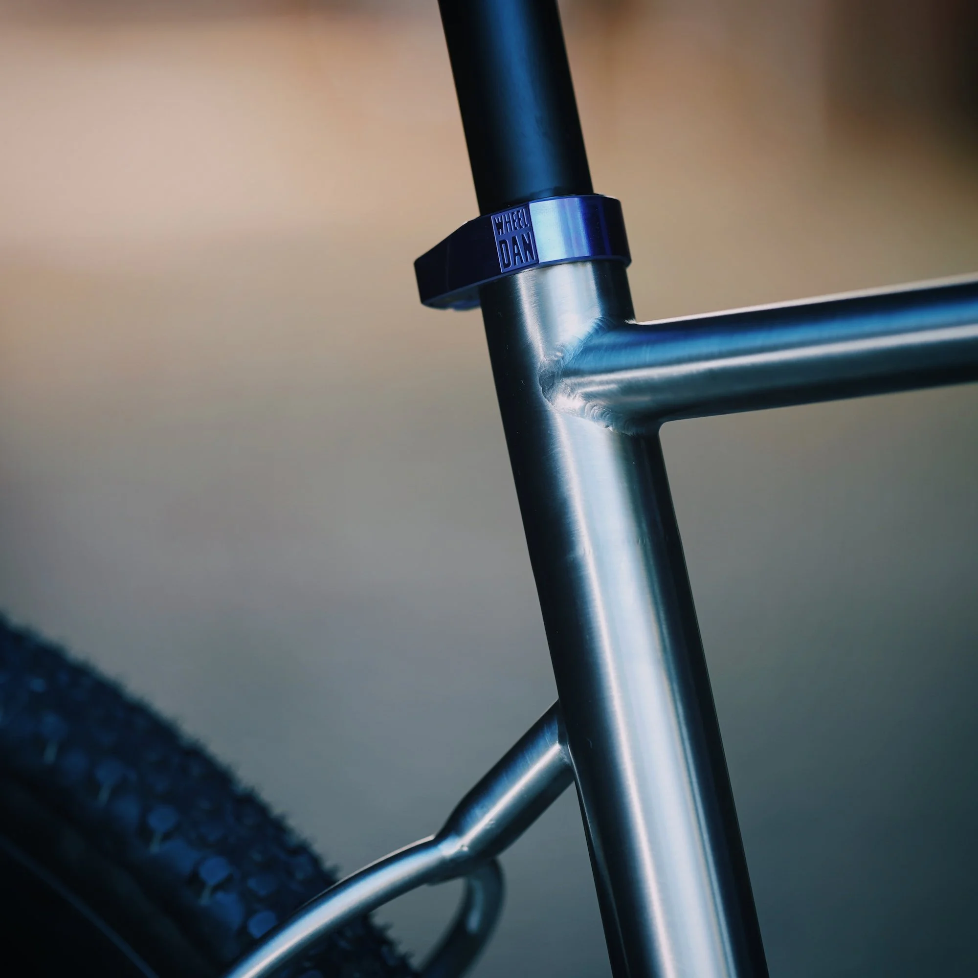 Ein leichtes, robustes und vor allem schnelles Bike aus dem Material der Magie. Handgefertigt in Deutschland von WHEELDAN. Absolut aufgeräumte Optik dank voll integriertem Cockpit. Bremszüge verlaufen in Rahmen und Gabel, geschaltet wird per Funk. Rahmen mit starkem unterem Teil für die Portion Steifigkeit und zartem Oberteil um über Unebenheiten zu schweben. Gemacht für Reifen in der Dimension bis 700x50. Reifen mit genügend Grip und Geschmeidigkeit. Gesamtgewicht 8.9kg. 4 Paar Ösen fürs Allerlei. Dazu 2 Dreifach-Ösen an der Gabel. Der kühlen zurückhaltenden Optik des Titan setzen wir ein paar warme Kontraste an die Seite. Die Rahmengrösse passt für Menschen von ca 175 bis 185cm. Showbike für die Messe BESPOKED in Dresden. Rahmenbauers Traumbike für schnelle Touren!