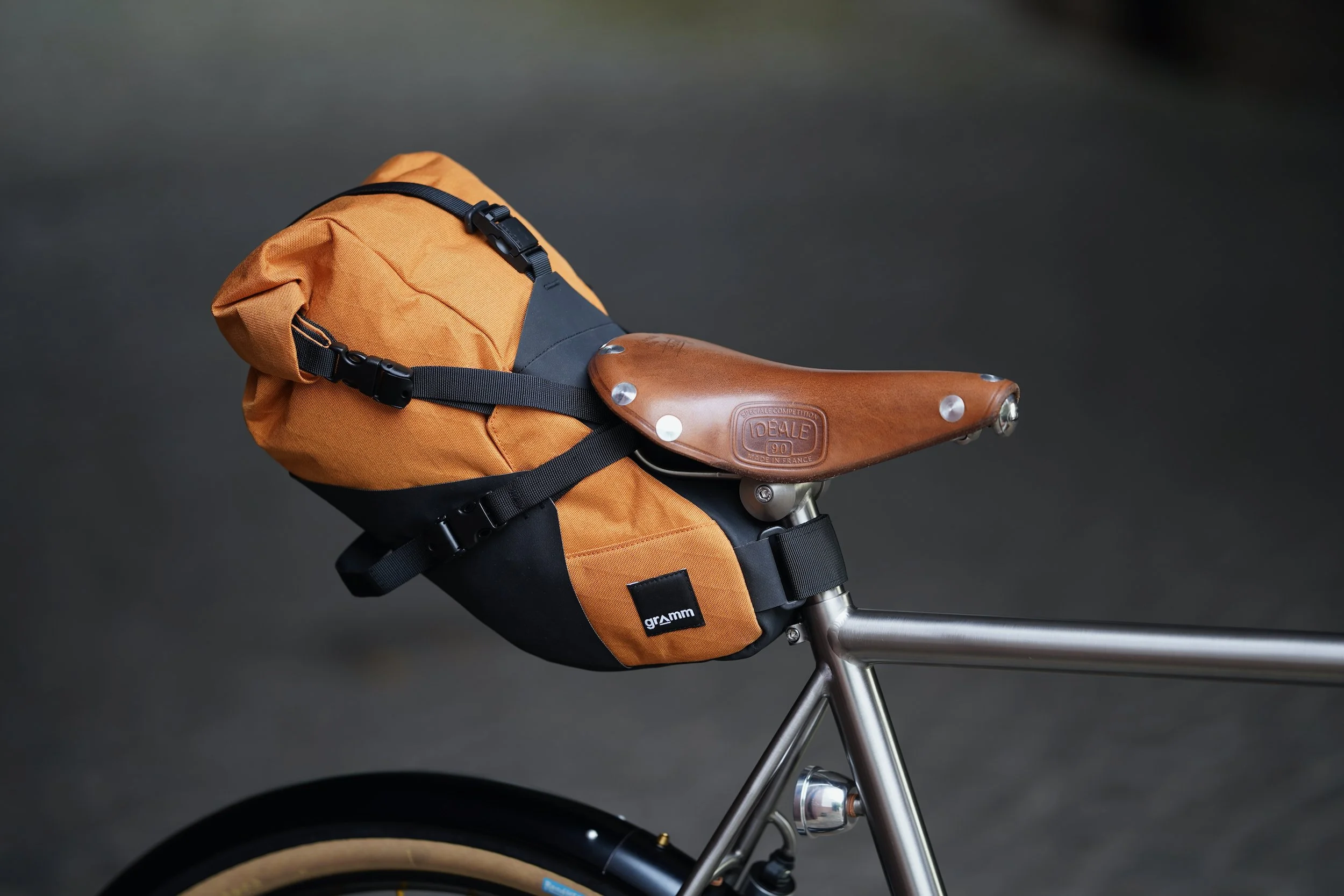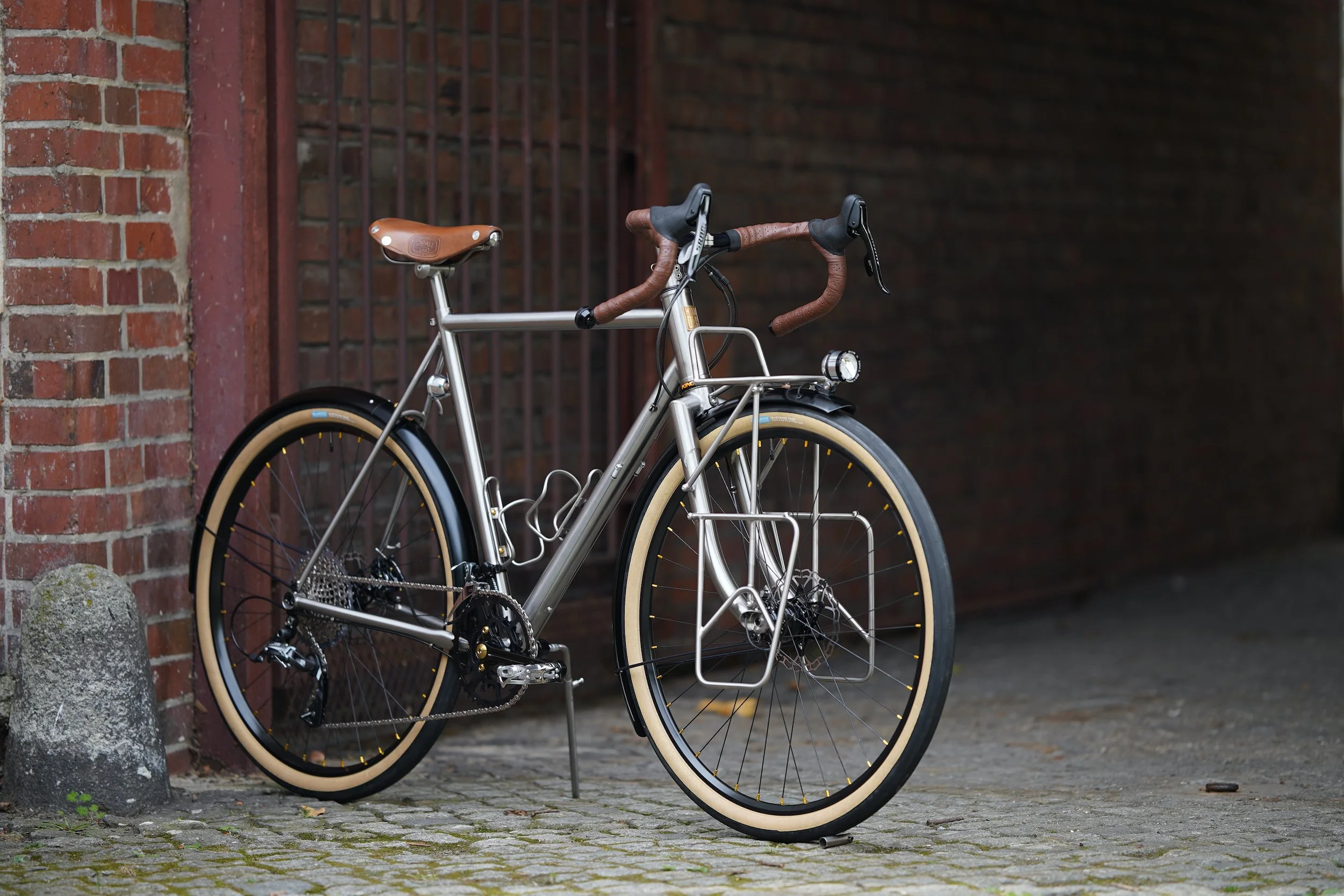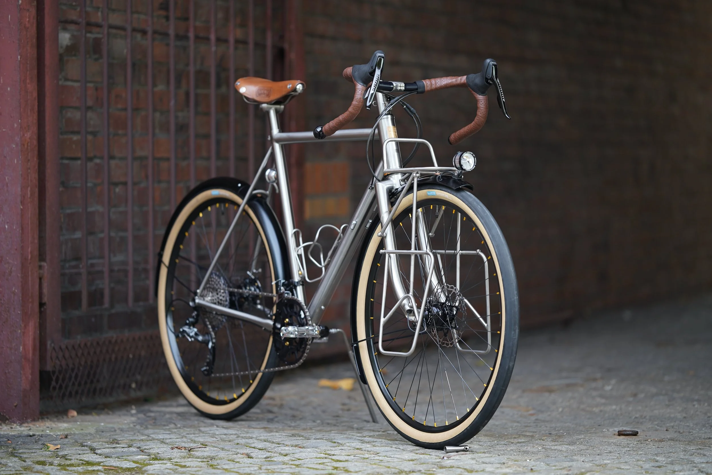 bespoked titanium randonneuse, wearing a dress from my berliner friends grammtourpacking . That’s the updated version of my superlight randonneuring rig wanderlust . All the best from the past merged with contemporary aerospace materials. Wheeldan handmade bespoked titanium Frame + Fork + Frontrack + Lowrider + Seatpost + Stem! Complete matching custom set of bags by GRAMM. The whole bike is made with the japanese RINKO travel concept in mind. Easy to pack the whole bike in a frame size bag.