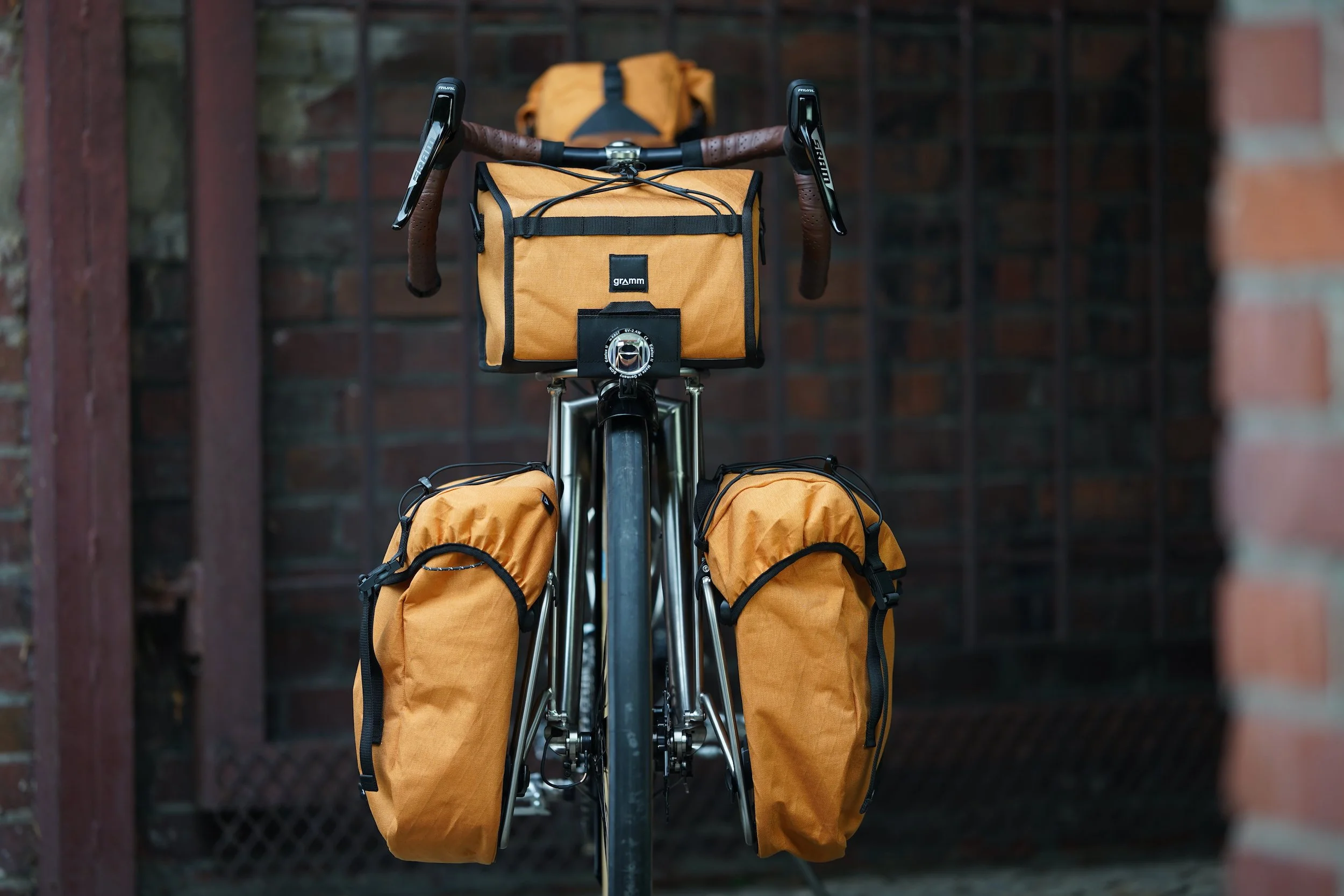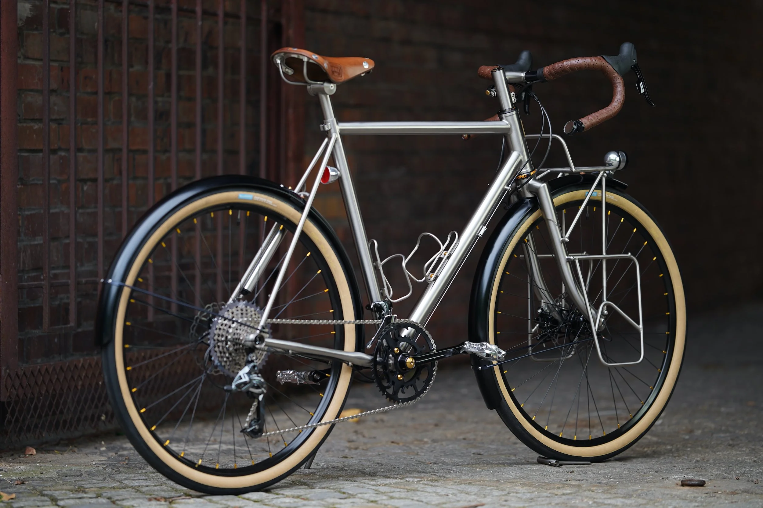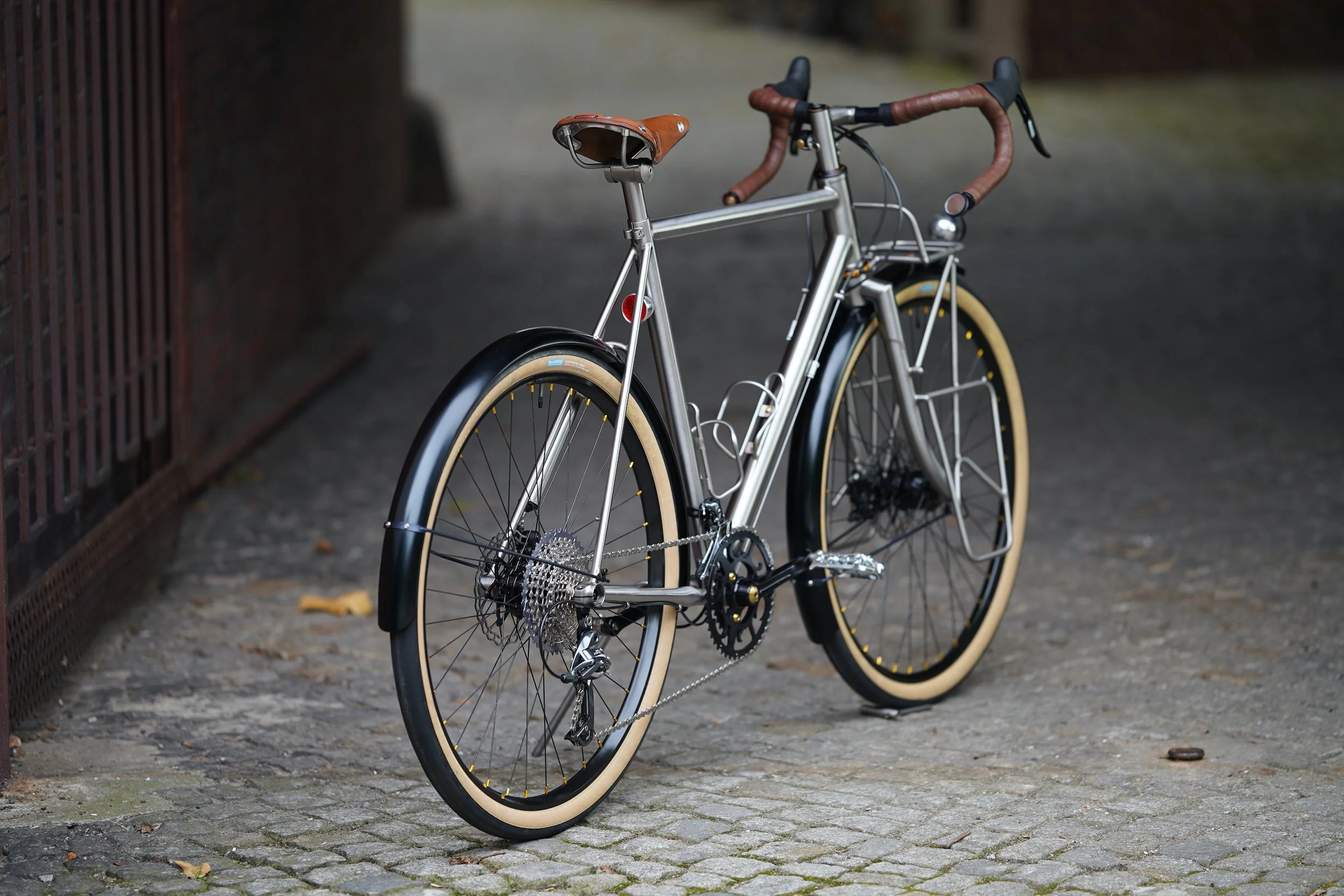 bespoked titanium randonneuse, wearing a dress from my berliner friends grammtourpacking . That’s the updated version of my superlight randonneuring rig wanderlust . All the best from the past merged with contemporary aerospace materials. Wheeldan handmade bespoked titanium Frame + Fork + Frontrack + Lowrider + Seatpost + Stem! Complete matching custom set of bags by GRAMM. The whole bike is made with the japanese RINKO travel concept in mind. Easy to pack the whole bike in a frame size bag.