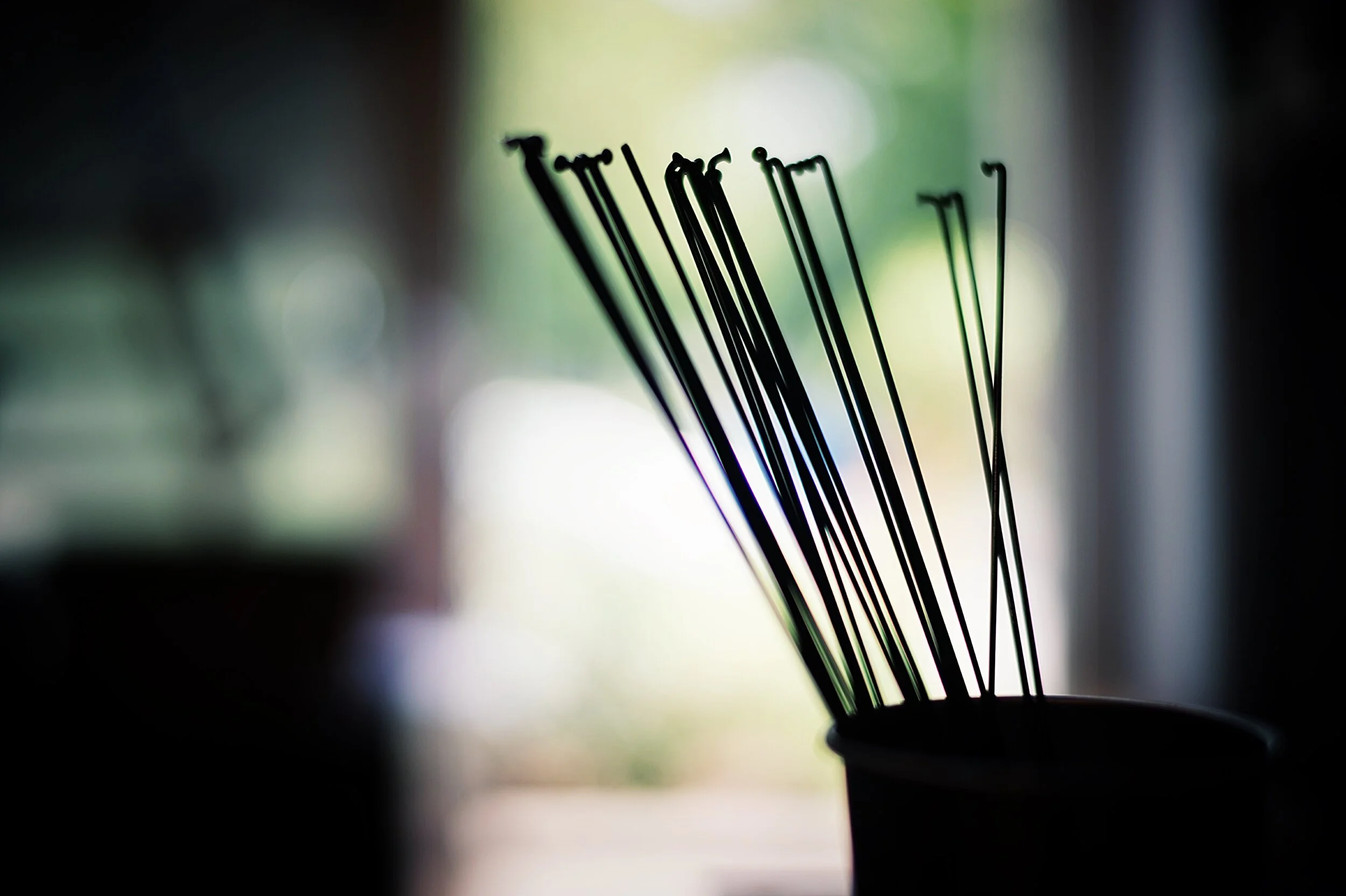 Neben dem perfekten Rahmen gebührt dem Laufrad mein ganzer Respekt. Die Auswahl der Komponenten unter Berücksichtigung von Einsatzzweck, Geräuschempfindlichkeit, Gewicht und Geldbeutel, Berechnung der korrekten Speichenlänge, Kalibrieren der Messgeräte je nach Material, einspeichen, zentrieren, abdrücken, wieder zentrieren, herstellen einer maximal möglichen und vor allem gleichmäßigen Speichenspannung, wenn es sein muss auch das Binden und Verlöten von Speichenkreuzungen. Dabei achten wir neben den technischen Aspekten auch darauf dass das Laufrad in das Design des Bikes passt. Werbebanner werden nicht geduldet, Farbakzente des Bikes finden sich auch im Laufrad wieder. All das führt zu einem extrem langlebigen Laufrad welches eine Augenweide ist und mit dem es Spaß macht unterwegs zu sein.